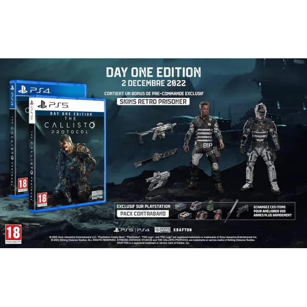 L'édition Day One comprend : le jeu The Callisto Protocol, les skins de personnage et d'arme Prisonnier Rétro. Et le pack Contrebande en exclusivité sur PlayStation.